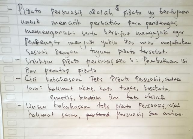 Pidato adalah suatu kegiatan berupa ucapan dengan susunan yang baik untuk menyampaikan gagasan kepada orang banyak. Pembukaan teks pidato persuasi terdiri atas tiga bagian, yaitu salam pembuka,. Salam pembuka, pendahuluan, inti, penutup, dan salam penutup.